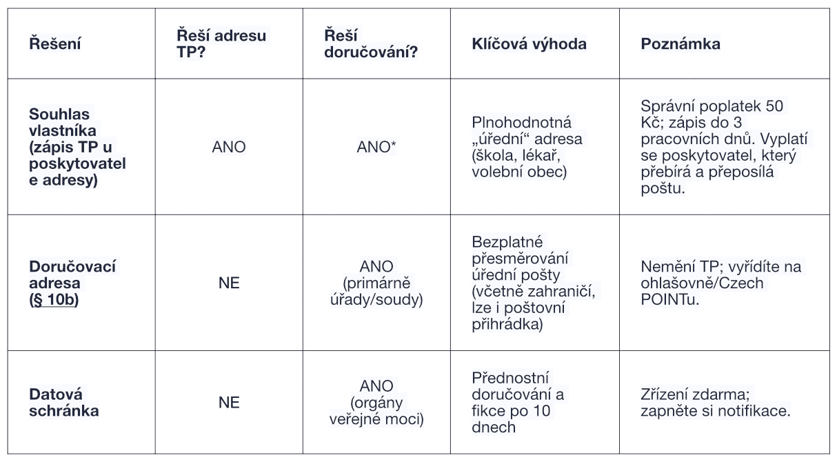 V praxi jde o kombinaci tří oficiálních postupů: skutečný zápis trvalého pobytu se souhlasem vlastníka, doručovací adresa podle § 10b zákona o evidenci obyvatel a datová schránka pro přednostní doručování od státu. Díky tomu máte komunikaci s úřady pod kontrolou a žádná důležitá zásilka nezapadne.